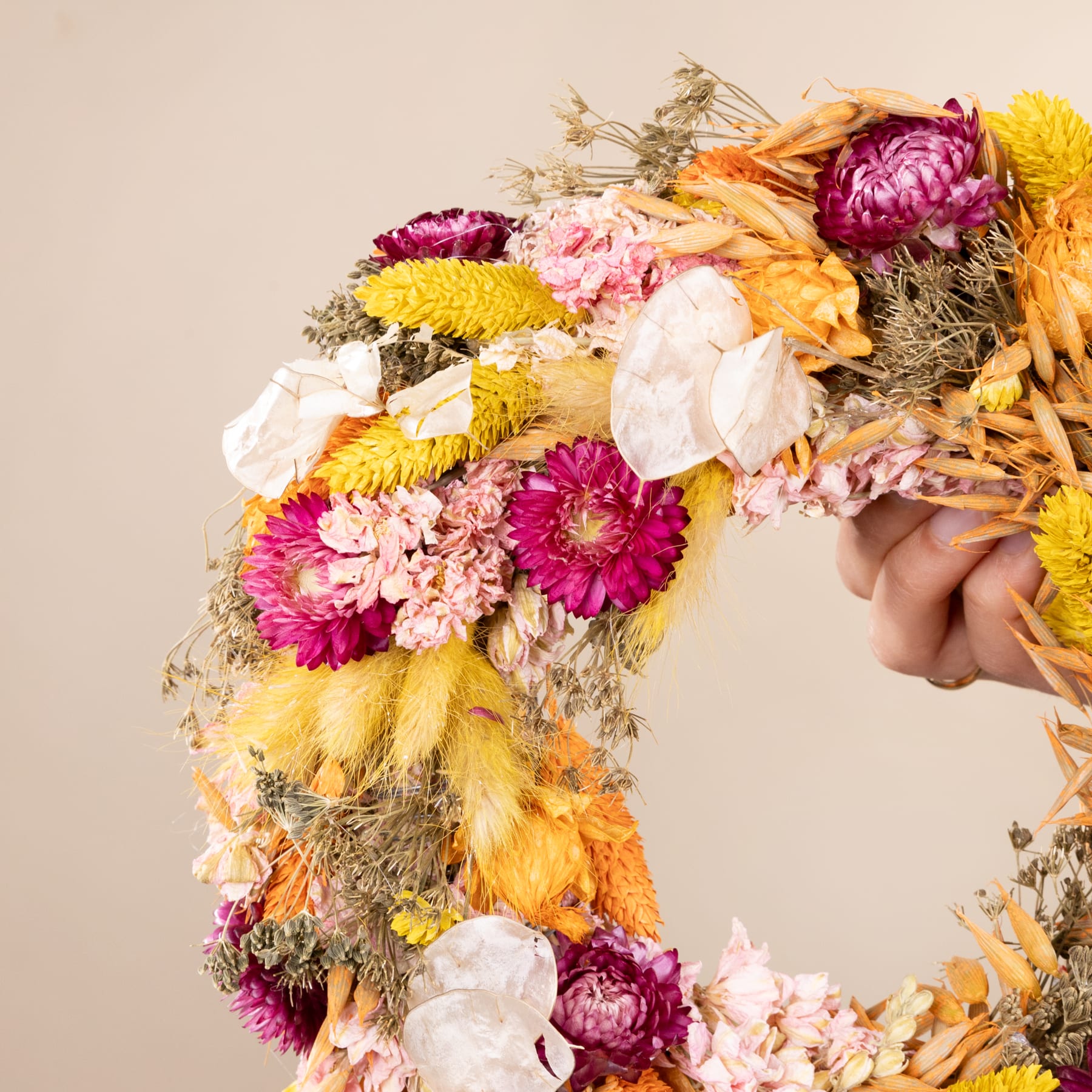 Verschenke Freude und Sommerzauber mit dem Trockenblumenkranz Sunshine Orange! Mit einem Durchmesser von 25 cm bringt dieser fröhliche Kranz leuchtende Farben in jedes Zuhause. Natürliche pinke Strohblumen, rosafarbener Rittersporn, gelbe Phalaris und flauschiger Lagurus vereinen sich mit einer Auswahl an orangefarbenen Trockenblumen und edlem Silberblatt zu einem harmonischen Gesamtbild. Ob als Tischdekoration oder Türkranz – der Trockenblumenkranz Sunshine Orange ist ein zeitloses Geschenk, das stets an deine Liebe und Wertschätzung erinnert. Die Trockenblumen sind ewig schön, doch beachte bitte, dass sie durch Sonneneinstrahlung verblassen können. Verschenke diesen bezaubernden Kranz an deine Liebsten und bringe ein Stück Sommer in das Leben deiner Lieben!