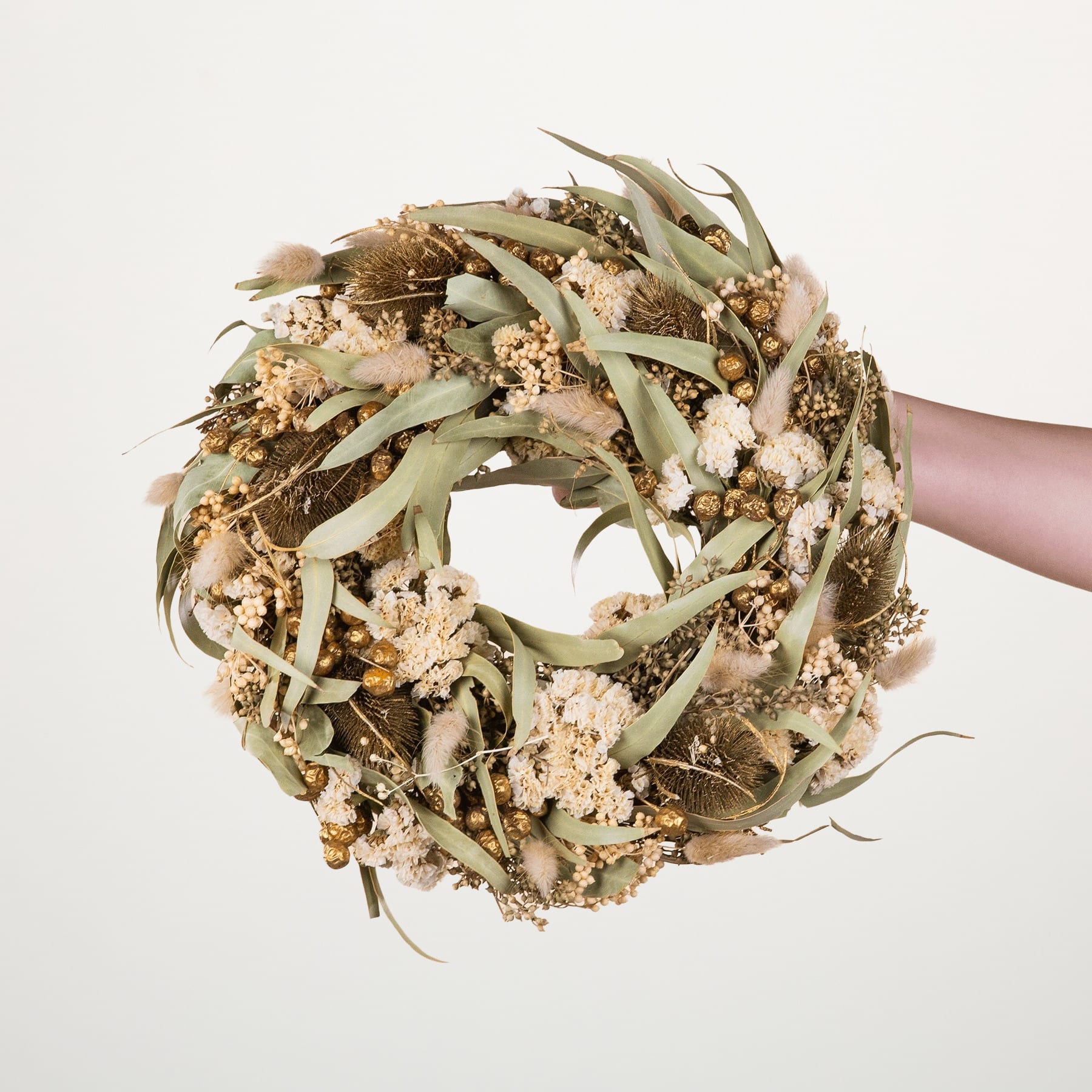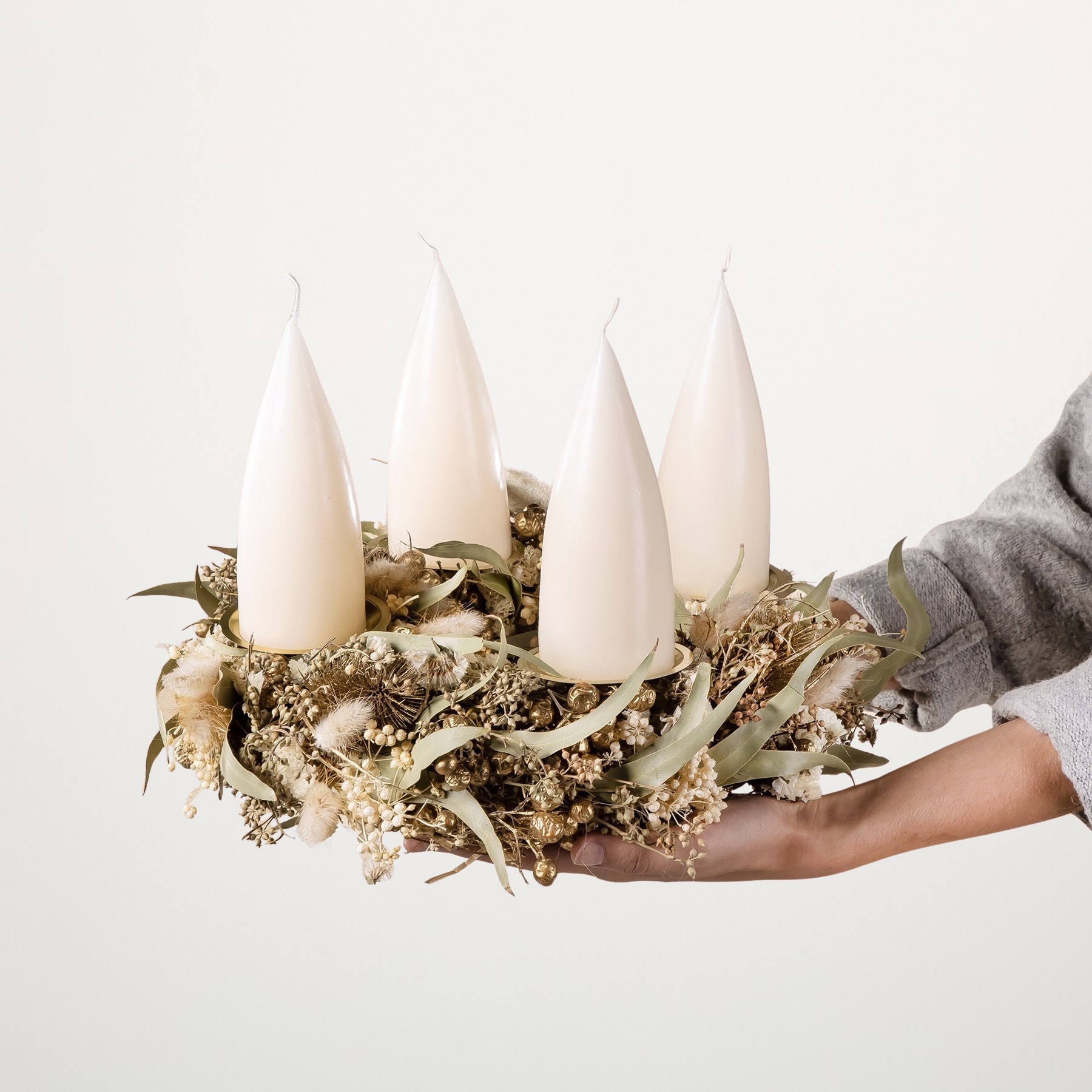 Was wäre die besinnliche Weihnachtszeit ohne einen festlichen Adventskranz und flackerndes Kerzenlicht? Mit unserem Trockenblumen Adventskranz Elegant Eukalyptus in Grün, strahlendem Weiß und festlichem Gold erhältst du ein besonders schönes Exemplar mit einem Durchmesser von ca. 30 cm. Er ist liebevoll von Hand gebunden und enthält zauberhaften Eukalyptus, exklusive Disteln, zartes Bupleurum, hübsche Statice, flauschiges Lagurus und kleine Beeren. Dem Kranz beigefügt sind handgezogene Kerzen aus Dänemark, die sich in einem hellen Cremeton präsentieren. Du musst nur noch die Kerzenhalter aufstecken und den Kranz mit den Kerzen bestücken, schon kannst du die herrliche Adventszeit bei flackerndem Kerzenlicht genießen. Die schönste Zeit des Jahres verdient diesen außergewöhnlichen Schmuck mit festlicher Eleganz!