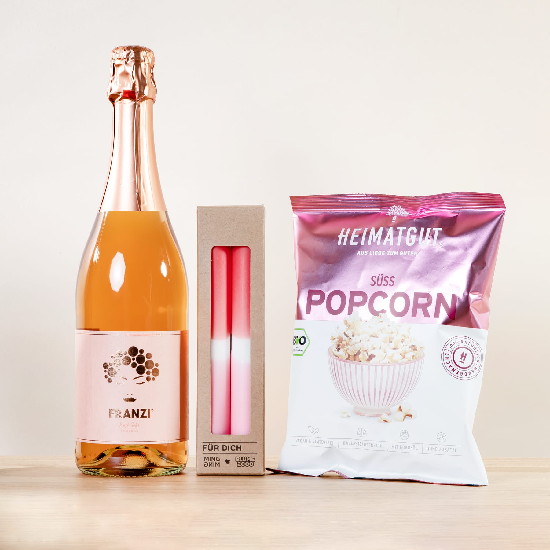 Alles Liebe zum Geburtstag! Mit unserem Geschenkset Pink Birthday Party wird der Ehrentag etwas Besonderes. Zusammengesetzt ist das Set aus einer Flasche Franzi Rosé Sekt mit prickelnder Perlage, einer Tüte Heimatgut Popcorn süß (30 g) in knackiger Kino-Qualität und zwei pinkfarbenen Ming Ming Dip Dye Kerzen mit einer Höhe von etwa 19 cm und einem Durchmesser von 2,2 cm. Die Brenndauer beträgt ungefähr sechs Stunden. Das vegane Popcorn in Bio-Qualität ist ohne Palmöl und ohne Gentechnik hergestellt. Anstelle von Butter wurde hochwertiges Bio-Kokosöl verwendet. Der aromatische Sekt verwöhnt die Zunge mit herrlichen Blubberblasen und einem Bukett von frischen Erdbeeren und Pfirsichen. Happy Birthday Lieblingsmensch, ich hab dich gern!