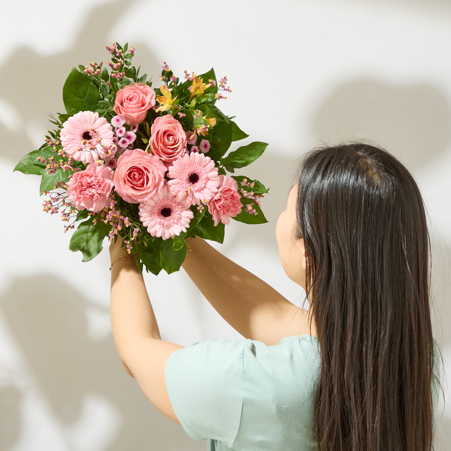 Manchmal braucht es nur einen Hauch Pink, um den Frühling spürbar zu machen. In diesem Strauß stehen Alstromerien im Mittelpunkt – Blumen, die als Symbol für Freundschaft und Beständigkeit gelten. Ihre feinen Blüten öffnen sich nach und nach und sorgen so für langanhaltende Freude. Umspielt von Rosen, Nelken und Chrysanthemen entsteht ein harmonisches Farbspiel aus Rosé und Pink, das Leichtigkeit und Wärme ausstrahlt. Salal und Pistazie bringen Frische, während Limonium zarte Akzente setzt. Mit einem Durchmesser von ca. 25 cm ist unser Strauß Think Pink perfekt für kleine Glücksmomente im Alltag. Ein Strauß, der leise verzaubert – und dabei lange in Erinnerung bleibt.