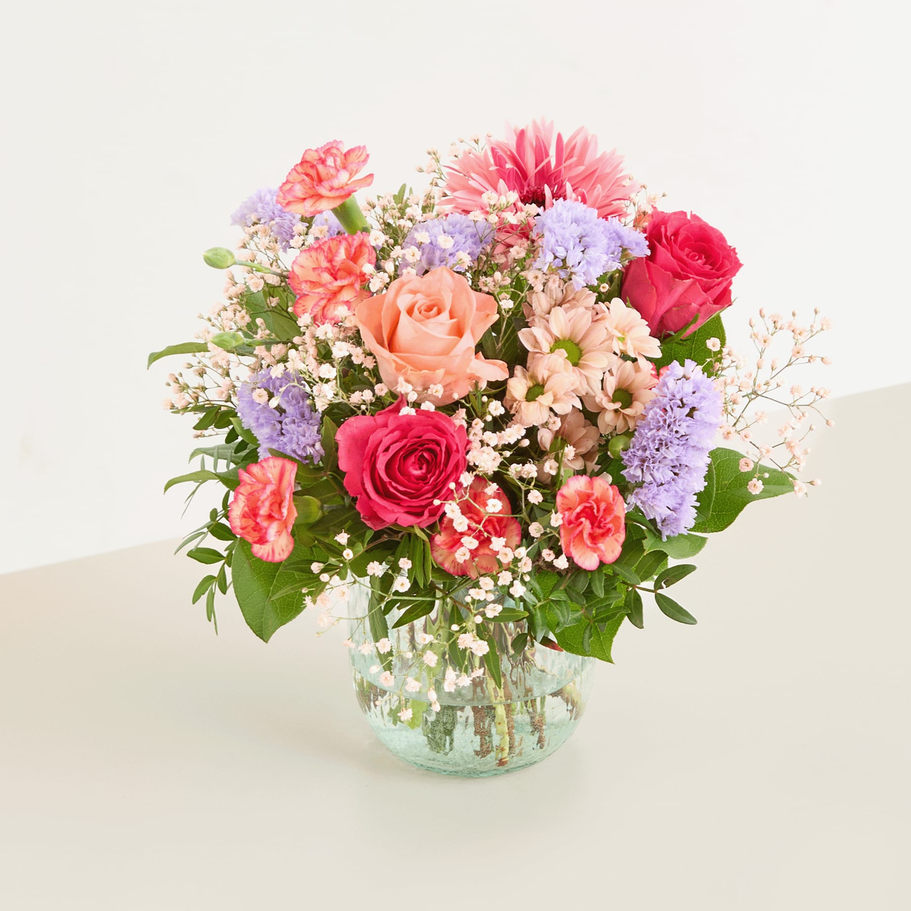 Natürlich, frisch und ungezwungen – dieser Blumenstrauß feiert die Schönheit des Einfachen. Im Mittelpunkt stehen Chrysanthemen, die für Langlebigkeit und Zuversicht bekannt sind. Ihre kräftigen Blütenköpfe verleihen dem Bund Struktur und Halt. Gerbera und Rosen bringen Farbe ins Spiel, während Schleierkraut und Limonium für Leichtigkeit sorgen. Mit einer Stiellänge von ca. 35 cm eignet sich dieser Bund ideal zum Verschenken. Chrysanthemen halten besonders lange frisch – perfekt für alle, die sich dauerhaft am Frühling erfreuen möchten. Ein Bund, der Raum für Kreativität lässt.