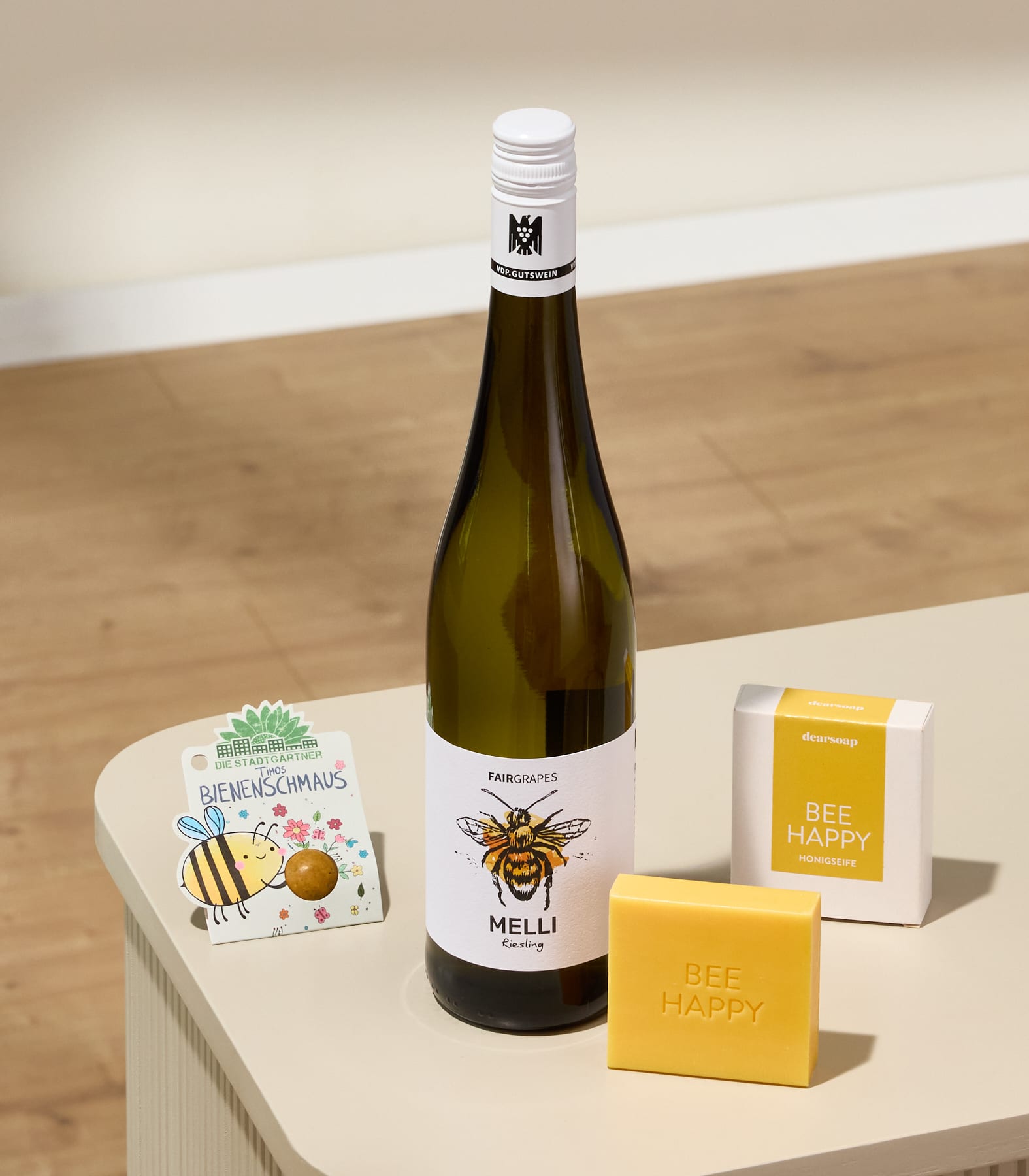 Ein Geschenk, das summt vor Freude: Das Set „Bee Happy“ ist eine liebevolle Aufmerksamkeit für Herzensmenschen, die kleine Genussmomente schätzen. Im Mittelpunkt steht die feste Seife mit warmem Honigduft – sanft pflegend dank Oliven- und Kokosölen, ganz ohne Palmöl. Dazu gesellt sich der fruchtig-frische Melli Riesling (0,75 l), der mit seiner lebendigen Leichtigkeit jeden Anlass veredelt. Und als nachhaltiges Extra: Wildblumensaatgut für ein blühendes Dankeschön, das bleibt. Ob zum Geburtstag, als Überraschung zwischendurch oder einfach, um jemandem ein Lächeln zu schenken – dieses Set verbindet Pflege, Genuss und Natur zu einem rundum glücklichen Geschenk. Ein kleines Paket voller Sonnenschein, das sagt: Du bist wichtig.